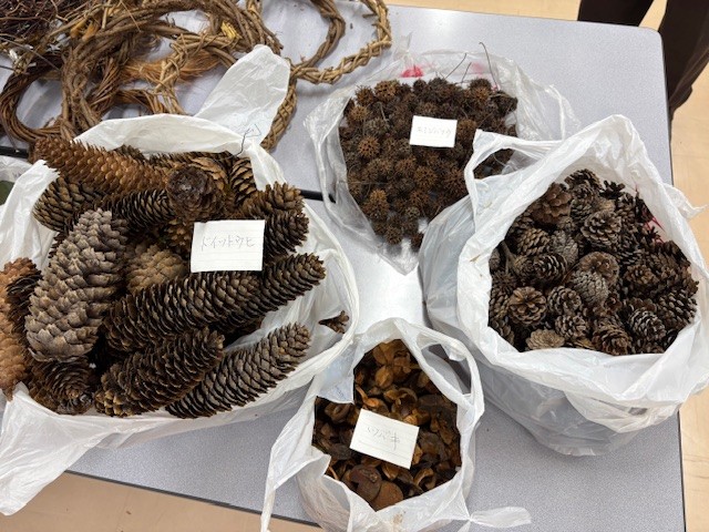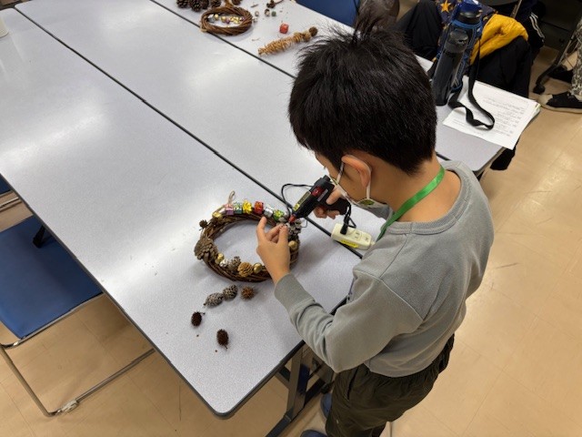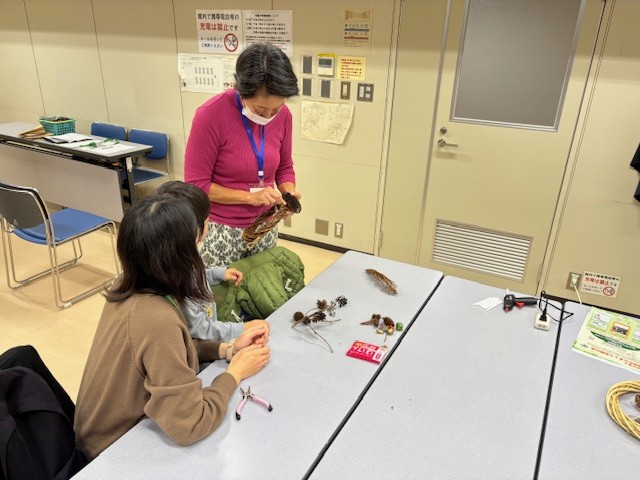 今回は、親子で協力しながらクリスマスリース作りに挑戦!松ぼっくりなどの自然素材は、講師チーフの前川氏が府中市内の公園で時間をかけて集めてくれたもの。素材選びから作品づくりまで、みんなで楽しく取り組みました。