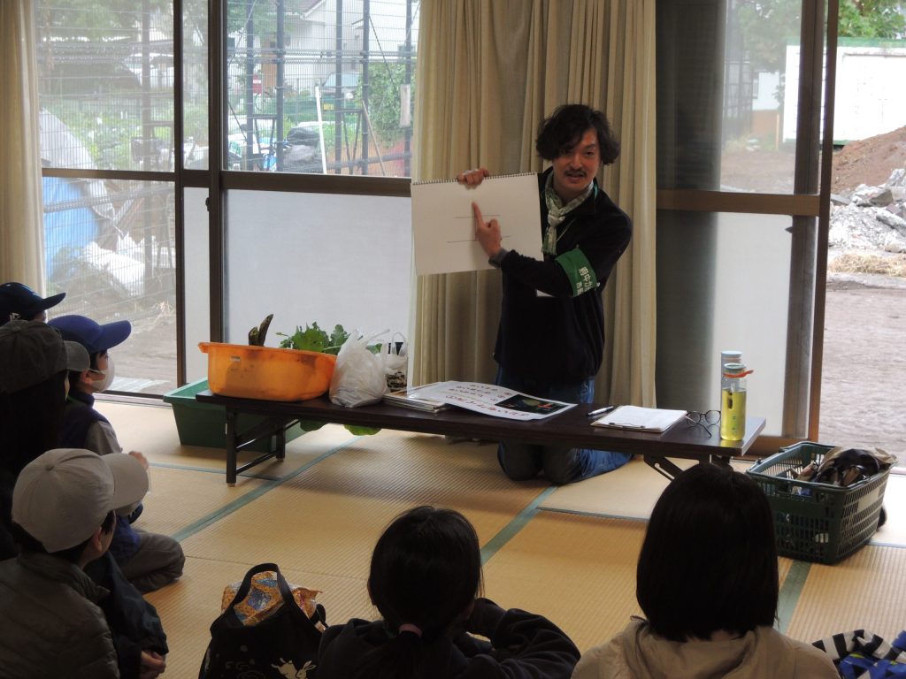 当日は朝から雨模様でしたが、公会堂での講義からスタートしました。講師は府中かんきょう市民の会の鈴木 淳佑氏です。まず「土」について、野菜や人とのつながり、さらに土壌生物(ハナテンハナムグリの幼虫など)の観察を通じて、有機栽培の大切さを学びました。土はヒト・虫・植物にとって切り離せない存在であり、私たちの生活に欠かせないものだと改めて実感しました。