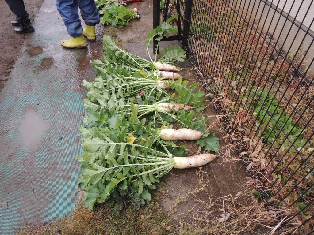 その後、雨が落ち着いたタイミングで圃場に移動し、農園塾スタッフのサポートのもと、参加者の皆さん自身で2種類の大根(白大根・紅大根)を収穫していただきました。収穫後には大根についての講座も行い、全てのプログラムを無事に終えることができました。