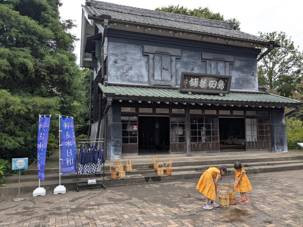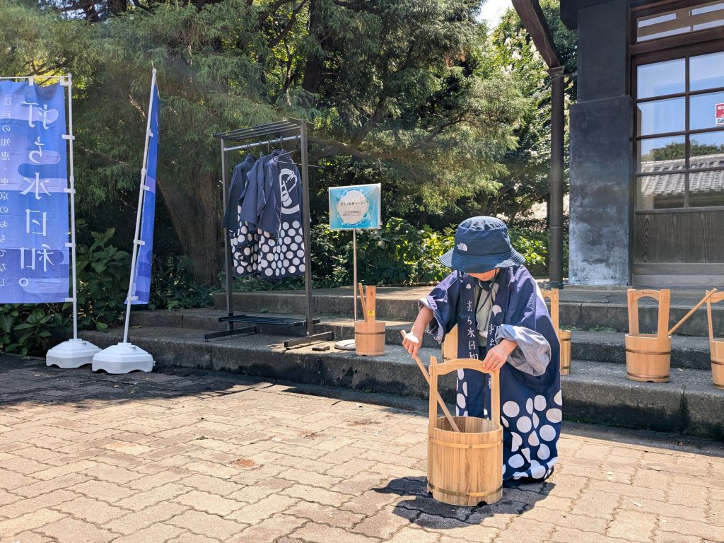 園内に再現された甲州街道府中宿の一角に打ち水コーナーが登場。来館者が江戸の情緒を楽しみながら体験しました。